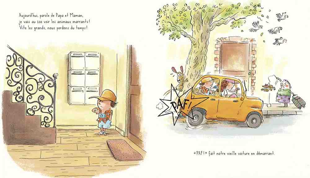 ” Aujourd’hui, parole de Papa et Maman, je vais au zoo voir les animaux marrants! Vite les grands, nous perdons du temps! ” PAF!” fait notre vieille voiture en démarrant.”