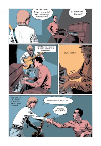 C’est un formidable document orchestré par la partition de Ceka qui alterne textes biographiques et récits graphiques de 19 dessinateurs différents aux talents connus et reconnus tels : Bruno Loth, Lapuss, Joël Alessandra, Sanzito, Patès, Domas, Bast, Patrick Lacan, Amélie Neyret….autant de styles et d’accroches distincts d’une épopée depuis cette improbable rencontre entre Richard et Jagger, jusqu’à leur dernière tournée en 2017 “No Filter Tour”, en racontant les débuts du groupe, les filles, le sexe, les drogues, la disparition de Brian Jones, le choix du nom, la venue de Ron Wood, les caprices, les délires , les caprices et les tiraillements entre les membres…