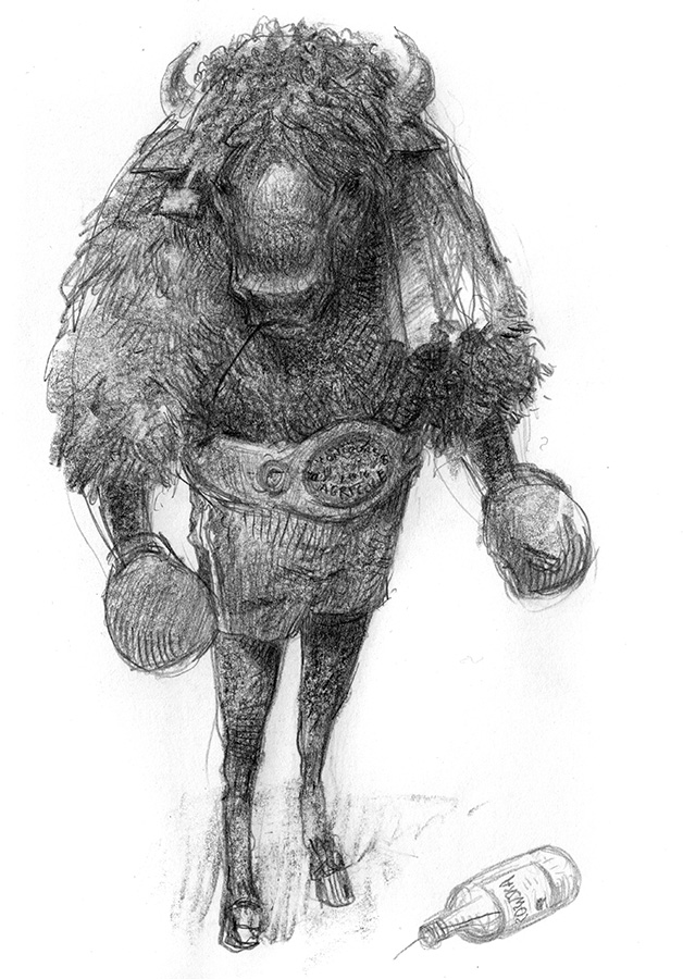 Je me demande par exemple quel genre de costume pourrait porter tel ou tel personnage. Dans un des dessins, un bison est représenté en boxeur. Cet animal était en fait un voisin d’immeuble, une brute absolue qui passait ses journées à vider des bouteilles de vodka et de whisky ; son nez cassé à de multiples reprises avait quelque chose d’un mufle de bison. J’ai donc ajouté une bouteille de vodka “Herbe de bison” à ses pieds, pour coller au personnage. Ensuite, je me suis rappelé que les boxeurs gagnaient des ceintures avec un écusson. Je me suis donc amusé à mettre à la place un macaron “1er prix de viande rouge au marché de…”, comme ceux qu’on voit dans les boucheries. Il faut vraiment regarder de très près pour le voir, mais je trouve ça rigolo. Pour beaucoup de personnages, j’utilise des détails que je vois chez des gens croisés, des amis, etc. Même des dealers que je vois chaque jour dans la rue finissent transformés en animaux, comme le tarsier aux yeux énormes qui guette au coin d’une rue de ma ville.