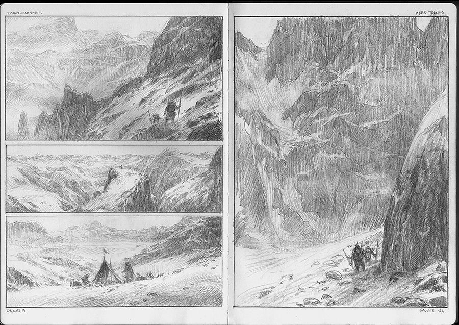 Le “Carnet Kipling” est un projet à part, extrêmement personnel. Il s’agit d’un carnet d’un peu plus d’une centaine de pages remplies de croquis, et d’une série d’illustrations à l’aquarelle, plus classiquement “illustratives”. Je ne saurais pas vraiment expliquer rationnellement ce projet, sinon par la passion presque absurde pour la nouvelle de Kipling. Il FALLAIT que je dessine ce texte. Enfant, j’avais été marqué par le film de John Huston, que mes parents m’avaient autorisé à regarder un soir à la télévision. Le film développe d’ailleurs à la perfection des tas d’idées qui ne sont qu’effleurées dans le texte de Kipling. J’ai accumulé des milliers de documents en rapport avec ce livre, le pays dans lequel il se déroule. Je crois qu’il y a, dans “L’homme qui voulut être roi”, une combinaison parfaite de tout ce qui me parle. Des contrées merveilleuses, la fin du dix-neuvième siècle, Alexandre le Grand, l’aventure, les mythes, les vestiges, les civilisations perdues, la beauté, la mort…