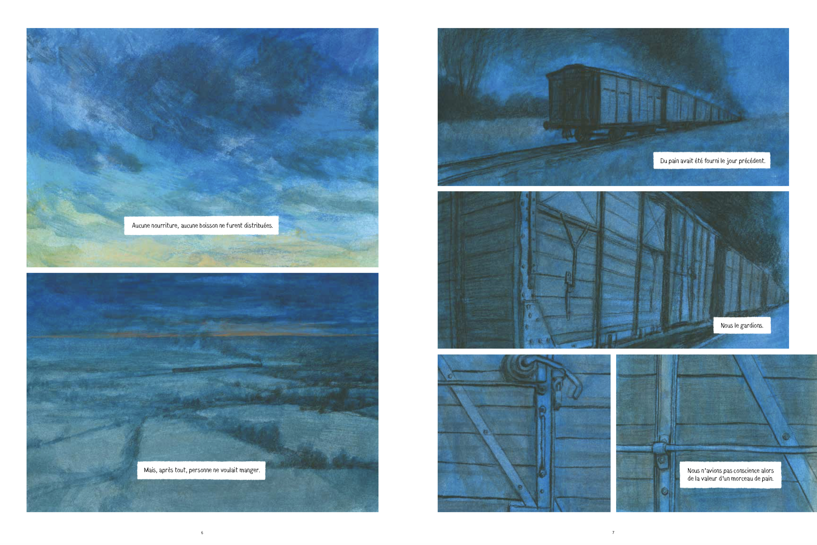 Gaétan Nocq restitue ce huit-clos avec une remarquable sensibilité. Usant d’une palette de couleurs réduite mais percutante et d’un dessin semi-réaliste qui se mêle à des ambiances impressionnistes saisissantes, il donne à ce camp les aspects d’un cauchemar avec talent. Quelques parenthèses d’évasion par le souvenir permettent parfois d’échapper à cet enfer…mais au réveil la réalité reprend elle aussi des contours chimériques dérangeants.