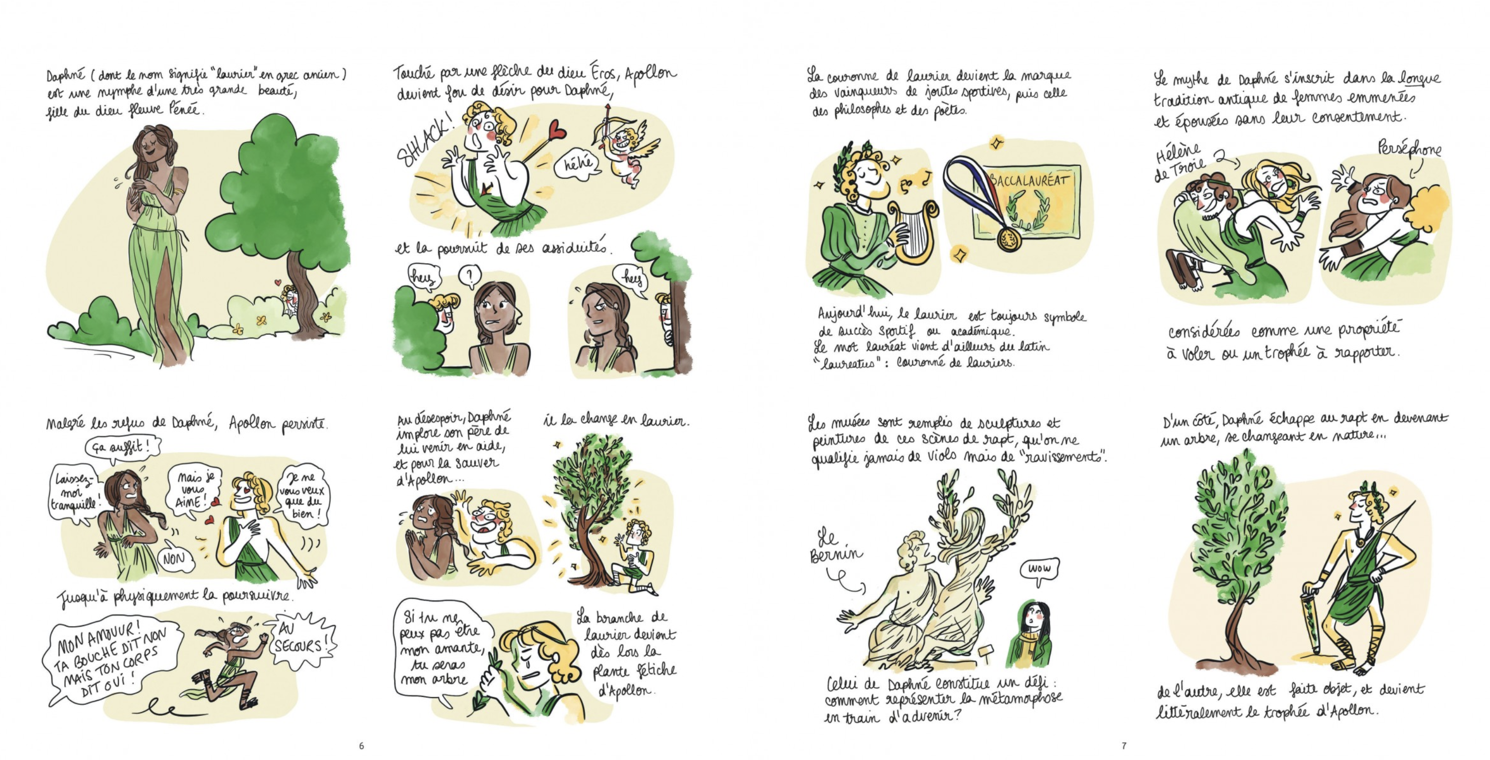 La nymphe Daphné, par exemple, poursuivie par le désir fou et incontrôlable d’Apollon, n’est qu’une des victimes dans la mythologie grecque des comportements masculins auxquels on ne peut échapper. Méduse, dont l’on ne retient que la figure de monstre effrayante, était au départ une belle jeune fille dont Poséidon s’éprend. Violée par ce dieu dans un temple dédié à Athéna, Méduse est punie par cette même déesse qui la transforme en Gorgone! …ou parlons de Perséphone, fille de Déméter, enlevée par son oncle pour devenir son épouse au sein des Enfers?!