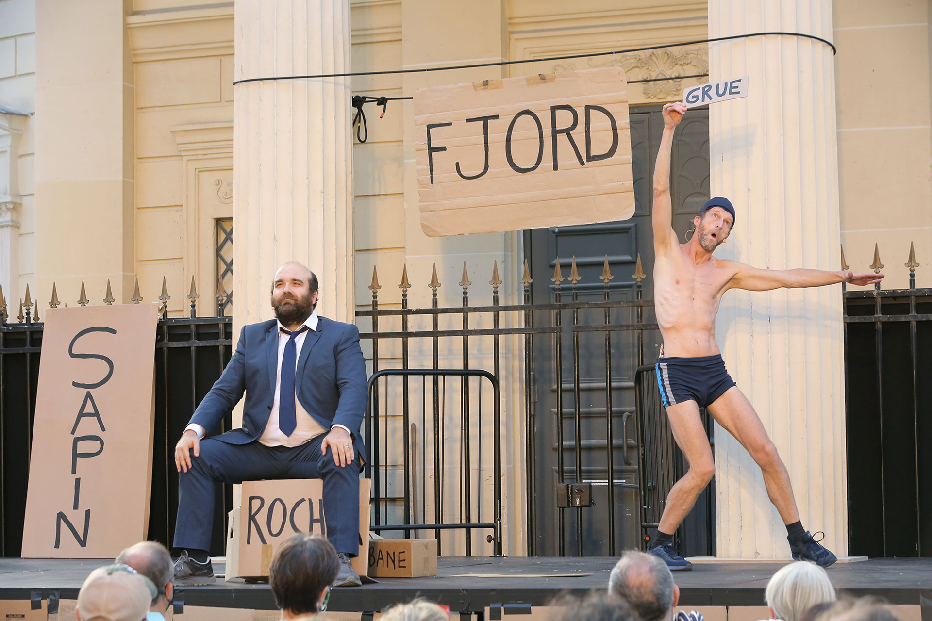 Un contraste entre le conteur et le mime, entre le texte et l’action : une narration façon cartoon subjuguée par ce duo parfait en auguste et clown blanc.