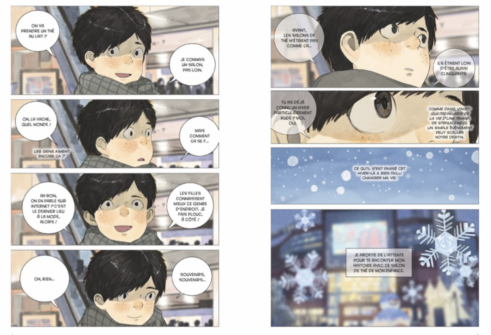 En prenant un thé au lait, sa mémoire le ramène à l’adolescence dans une ville minière du nord de la Chine…à sa rencontre avec Chen qui gérait un salon de thé, petite et faible lumière dans la morosité et la noirceur de la cité. He Liu évoque le départ soudain de sa mère, ses relations avec les garçons de son âge, ses difficultés dans un environnement cruel, sa rencontre essentielle avec Bouboule, un élève gourmand de soupes au bœuf, d’une rare gentillesse, as de jeux vidéo, qui influencera et lui apportera beaucoup.