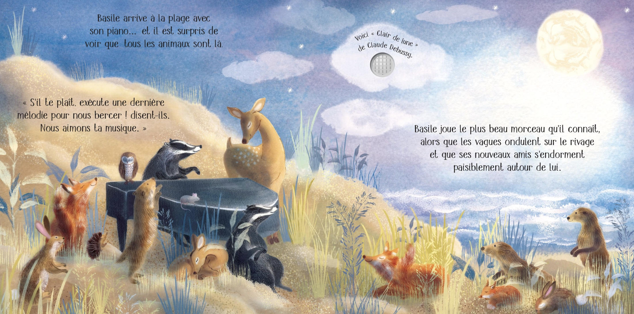 Enfin, pour les plus grands, nous vous invitons à plonger dans la musique classique avec vos tout-petits grâce au blaireau Basile qui joue merveilleusement bien du piano! De page à page, il offre cinq mélodies pour s’endormir ( Prélude en do majeur de JS Bach, Chanson de gondolier de Félix Mendelssohn, Prélude de la goutte d’eau de Frédéric Chopin, Traumerei de Robert Schumann, Clair de lune de Claude Debussy). Une petite histoire accompagne ce charmant album aux dessins pleins de rêverie; il est question de ce petit blaireau qui se sent bien seul et découvre au fur et à mesure que tous les animaux adorent ce qu’il joue et l’écoutent avec attention. Un bien joli livre!