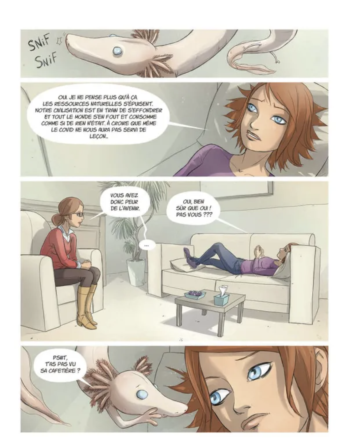 L’existence d’Ana n’est pas facile avec cette anxiété pernicieuse dont les racines profondes s’enfoncent dans l’enfance. Son ami imaginaire pallie le besoin de la jeune femme de parler, de communiquer, de s’exprimer. Son frère a abusé d’elle alors qu’elle était une enfant : les relations avec sa famille sont tendues. Seul Olm, l’ami imaginaire, compense. Un album émouvant et sensible. Un très bon moment de lecture.