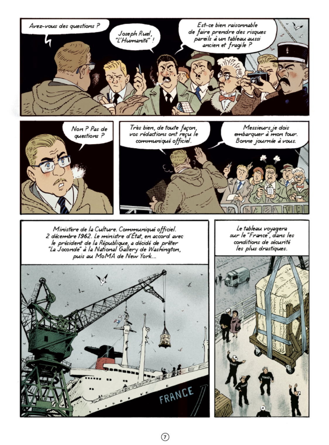 Cette escapade culturelle vers les USA avait marqué l’actualité en 1962 relatant un voyage quelque peu agité pour la Joconde, sans toutefois atteindre l’intensité du scénario de Bourgeron et Bourhis. André Malraux, îcone de la liberté et de la lutte contre le fascisme, fait figure dans cet album d’un être égoïste, misanthrope, dragueur, caractériel, affabulateur. Le dessin de Tanquerelle est très expressif et assez caricatural, en symbiose parfaite avec un récit qui n’est pas moins parodique. Un très agréable et très intéressant moment de lecture.