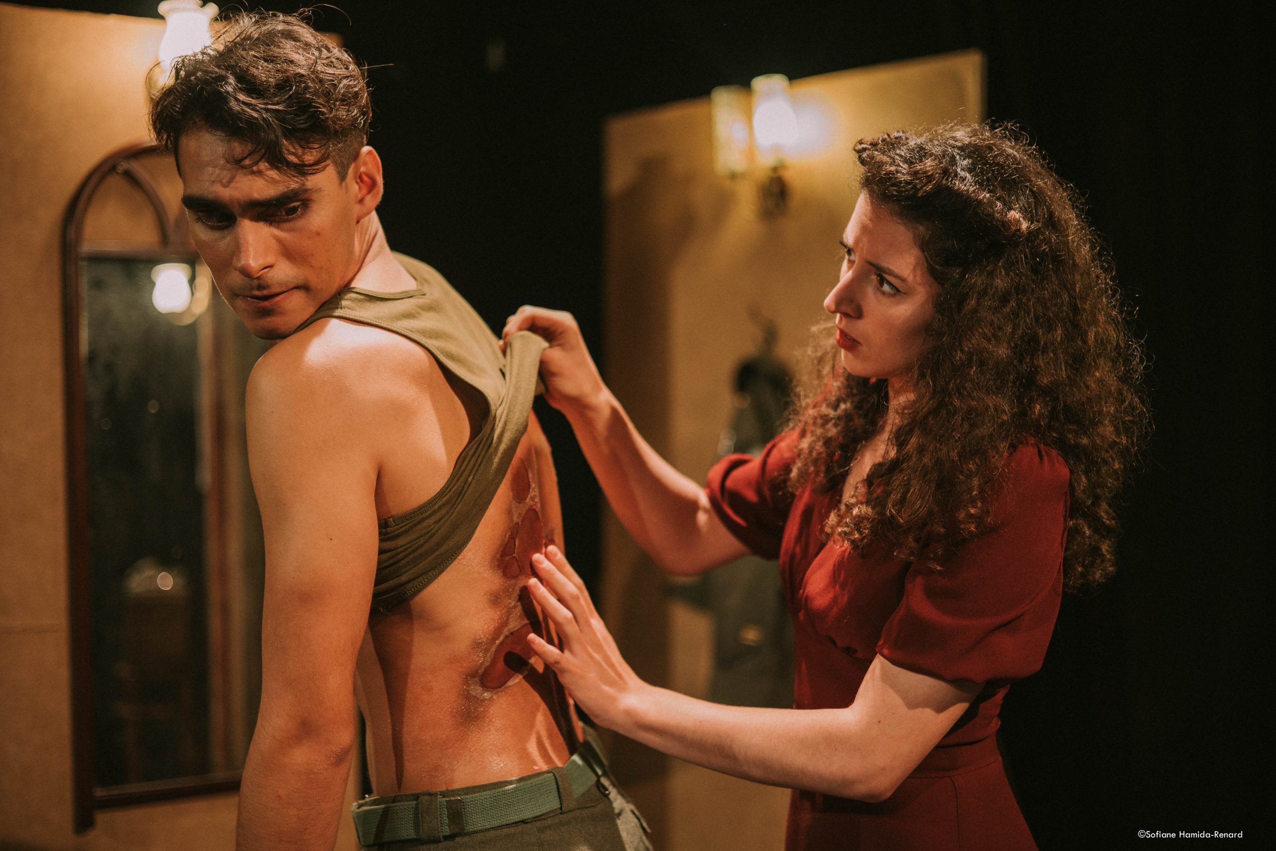 Ecrite par Erine Serrano, qui met en scène et joue l’épouse, Trauma met en lumière les dégâts, physiques –Vilas y a perdu un bras-, mais surtout psychologiques, causés par la guerre, sur les soldats mais également sur les proches : on peut parler, selon l’expression désormais consacrée, de « victimes collatérales ». Pour ces dernières, l’incertitude, l’attente constituent de véritables tortures. Le texte (Erine Serrano avait 19 ans quand elle l’a écrit), d’une cruelle nudité, donne à ressentir l’angoisse, les accès de violence et de haine, les doutes, obsessions envahissantes du soldat au front, puis les bouleversements qui s’opèrent plus tard dans leur tête. La description quasi clinique du carnage, rappelle que la guerre est une plaie qui contamine, sape les certitudes des individus. Trauma se refusant à glorifier l’héroïsme les combattants, comme la plupart des grandes productions cinématographiques, nous restitue les relents pestilentiels des corps en décomposition, de la merde, l’odeur âcre de la peur. D’aucuns pourraient trouver les descriptions trop crues, voire insupportables. Mais, c’est de guerre dont il est question. Et non ! la guerre n’est pas jolie.