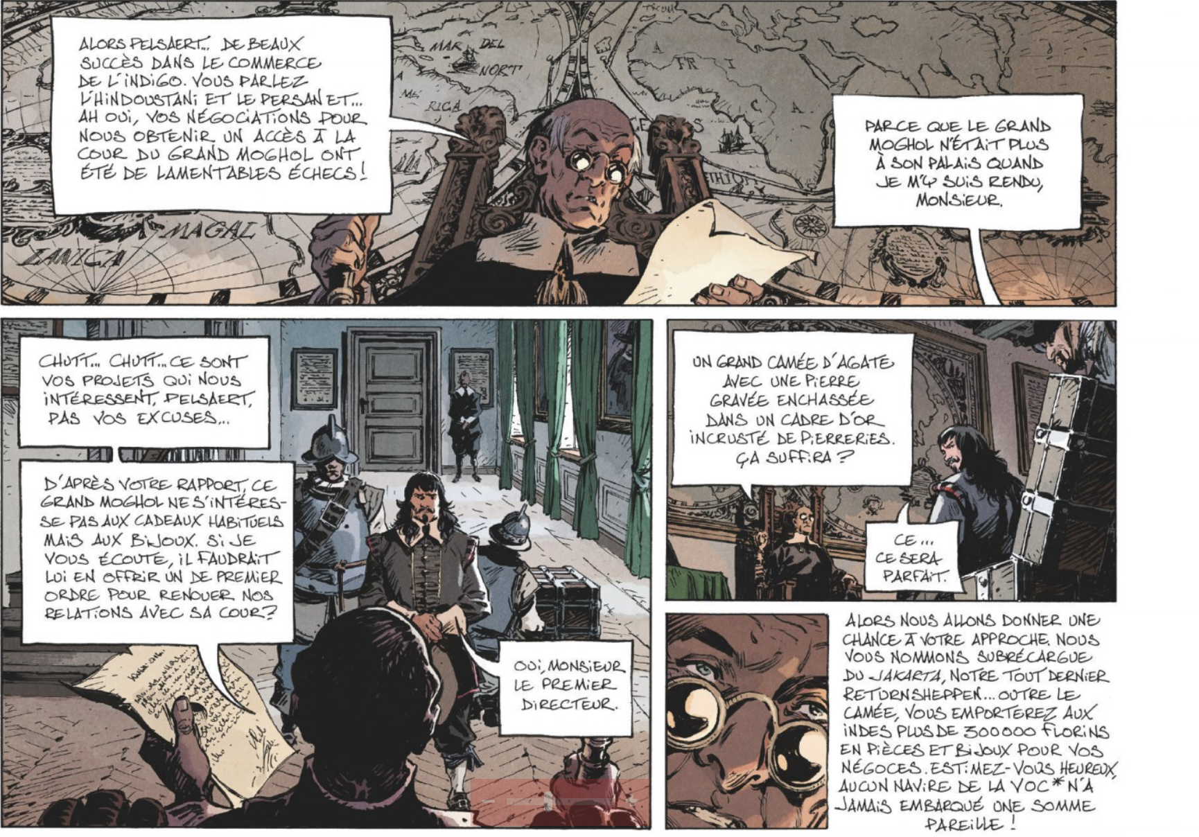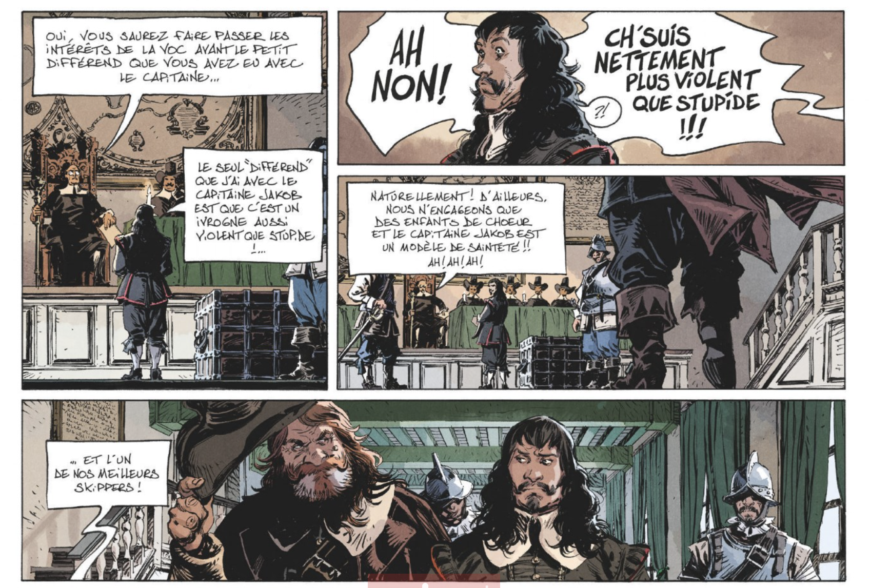 En préambule, Xavier Dorison précise que « bien que largement inspirée de faits réels, cette histoire reste une interprétation. Les auteurs y ont mélangé faits et inventions, et ce dans le but d’y servir la vérité qu’ils y voient ». Le scénario du premier tome de ce diptyque, cousu de fil noir ébène, est aussi tragique que passionnant. Le lecteur est tenu en haleine face aux enchaînements de rixes, crimes, tortures et drames qui se jouent dans le quotidien de cette embarcation infernale. L’on saluera particulièrement la qualité des caractères choisis : Lucrétia Hans, épouse infortunée au caractère bien trempé, est diablement attirante ; on attend avec impatience les apparitions salvatrices de Wiebbe Hayes, fascinant marin au grand coeur, une lumière dans les ténèbres ; chaque sourire de Jéronimus Cornélius au regard aussi perçant que Joaquin Phoenix ( la ressemblance est troublante…volontaire?) fait trembler ; on se prend à enquêter sur la véracité du caractère fourbe du capitaine Jakob, ours rugueux…et l’on apprécie la présence des autres personnages qui gravitent autour d’eux et s’imposent avec beaucoup de pertinence.