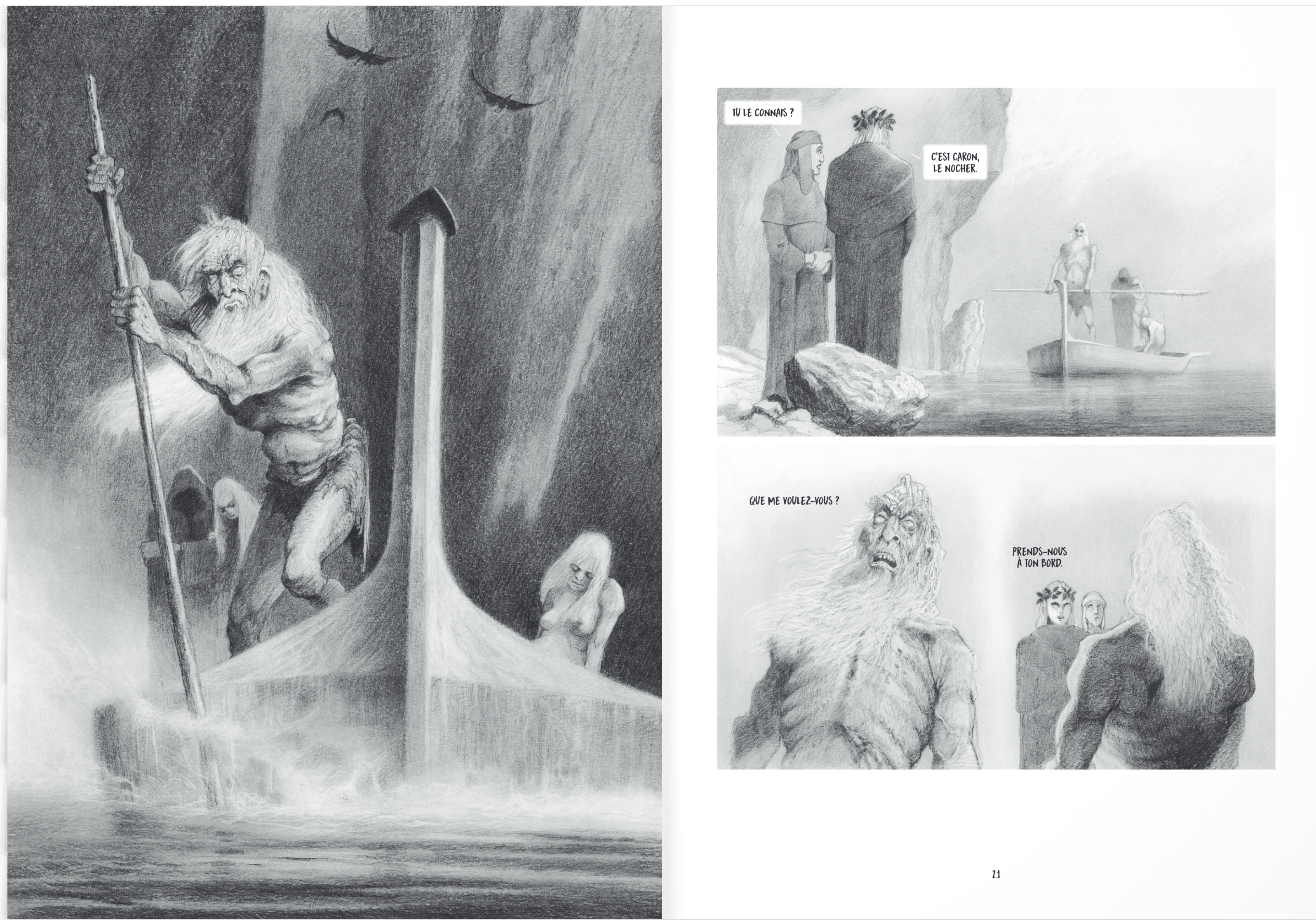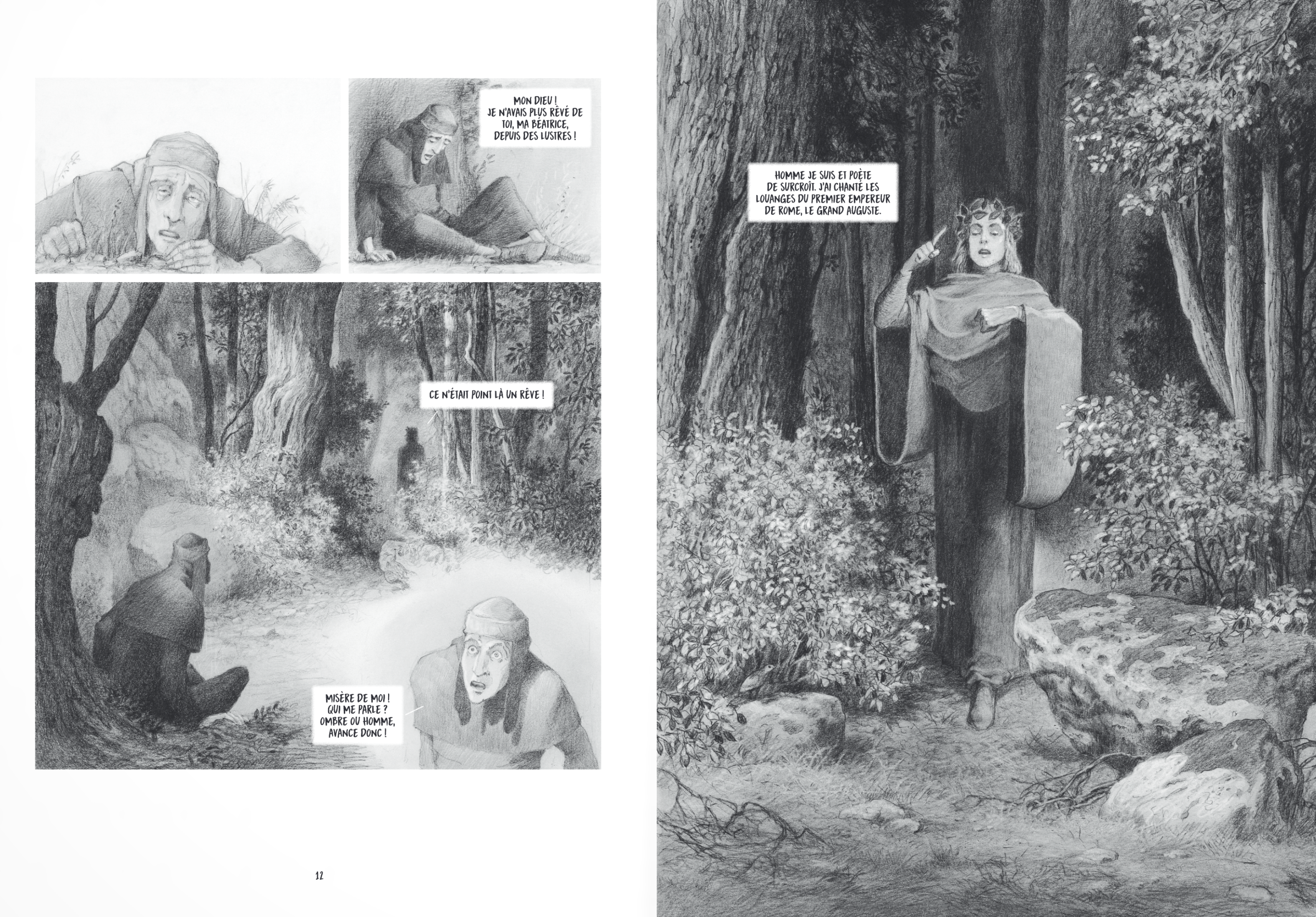 Le narrateur, Dante, a 35 ans : il est «  à la moitié du chemin de (sa) vie » ; il n’a plus envie de rien depuis que sa douce Béatrice est morte. Un jour où il est assailli par un cauchemar – deux bêtes féroces l’attaquent – et lui apparaît le poète Virgile qui se présente comme l’envoyé de Béatrice. Le poète latin va conduire Dante à travers l’Enfer et le Purgatoire pour qu’il puisse retrouver son aimée au Paradis. Ils traverseront neuf cercles concentriques où toutes sortes de vices sont sévèrement punis pour l’éternité. On y croise des figures mythiques ( Charon, Minos, le Minotaure, Diogène…), des créatures de l’Antiquité ( Gorgones, centaures…) mais aussi de l’imaginaire chrétien ( démons et anges…). De péripétie en péripétie, le lecteur est tenu en haleine en compagnie de Dante et Virgile qui ne manquent ni de courage, ni de persévérance ni d’une certaine forme de dérision libératrice.