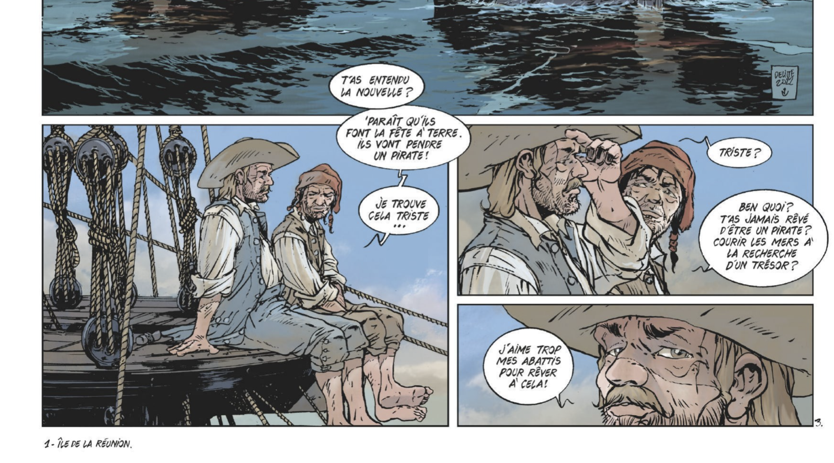 « La Buse » a forgé sa légende par ses abordages sanguinaires et ses prises de trésors sur les galions de tous pavillons. Richesses cachées dans les archipels secrets qui ont éveillé bien des fantasmes et nourrit des prétentions. Yves Delitte (peintre officiel de la Marine Belge) excelle dans ce type de narration et en particulier dans l’histoire de la piraterie (« Black Crow »). Le dessin est d’une qualité remarquable et d’un détail époustouflant ; les couleurs sont en parfaite symbiose avec le texte et le graphisme. Un très bon moment de lecture pour ce diptyque dont on attend impatiemment la suite.
