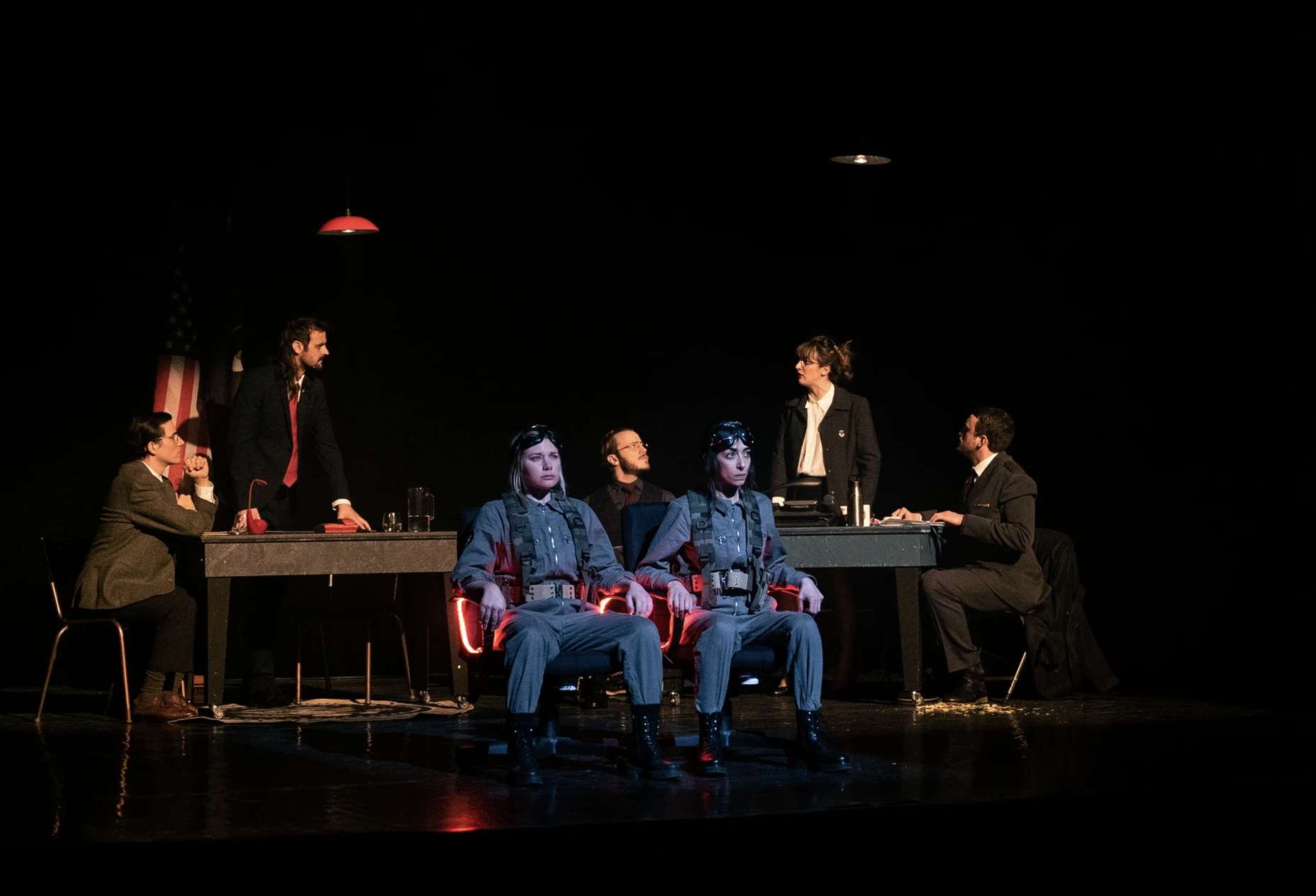 La scénographie est, elle aussi, très réussie scindant le plateau en deux parties séparées par le bureau du Président américain. Par un jeu de chaises musicales, les bombardiers apparaissent sur l’avant-scène, apportant un effet premier plan et arrière-plan. Pièce chorale, elle maintient la présence et la tension des personnages sur la durée. Quant aux costumes, ils donnent toute la crédibilité historique à l’ensemble.
