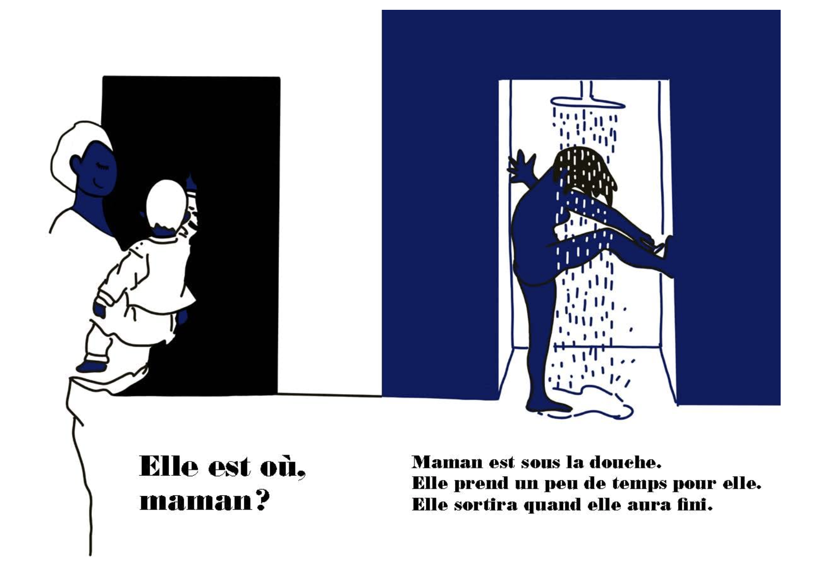Adeline Grais-Cernea a imaginé un tout-carton au graphisme aussi contemporain qu’attrayant, qui, page après page, joue avec une couleur dominante et des formes qui reviennent ( le coeur, l’étoile…). Les textes sont empreints de tendresse , sur la page de gauche, la question qui revient ” Elle est où, Maman?”, et sur la page de droite, des réponses illustrées et simples qui, tout à la fois rassurent l’enfant et l’invitent doucement à comprendre que Maman a droit aussi à ses moments de liberté.