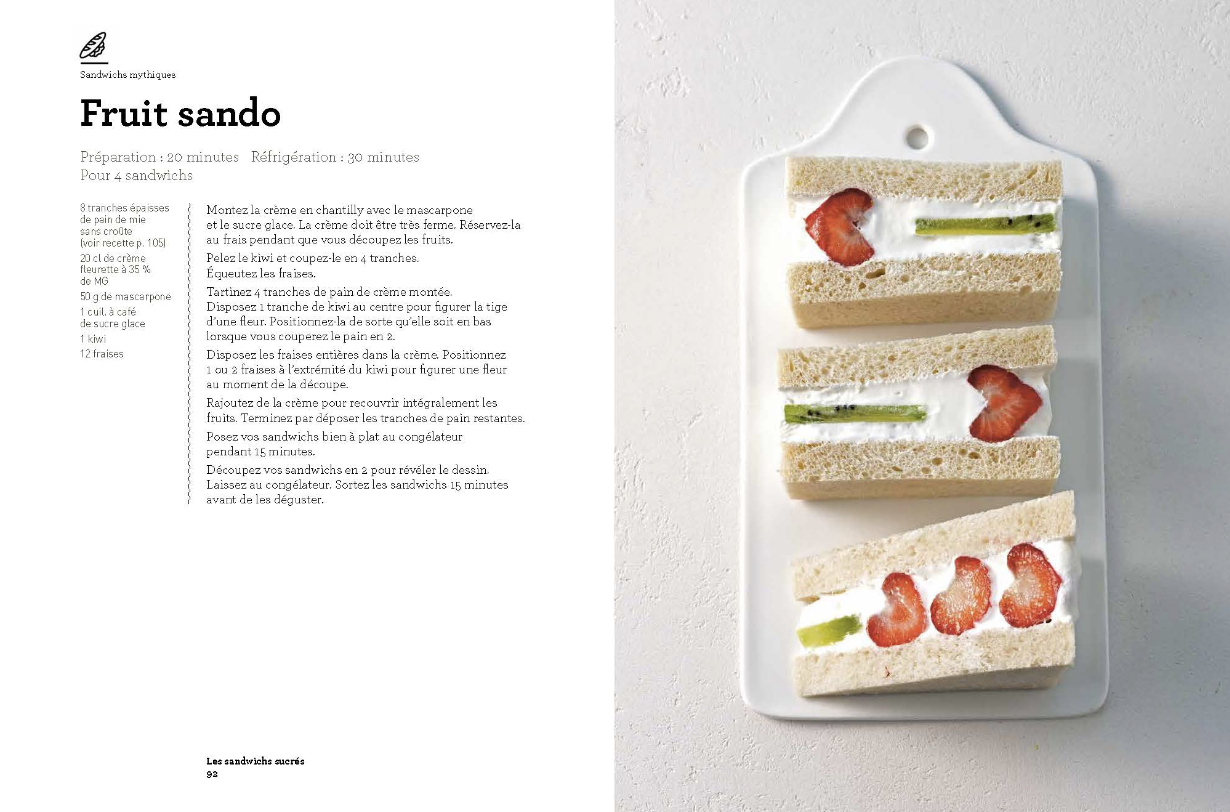 Julie Schwob revisite – entre autres !- le jambon beurre…en variant les beurres ( paprika / aux herbes / aux agrumes), le Pan-bagnat avec radis, tomates, cébettes en fines rondelles, céleri et poivron, le Philly cheesesteak à manger bien chaud et bien grillé, le Bagel lox, la Focaccia au speck et à la truffe, le Pletzel, le Pizza roll……et côté sucré gourmant : le Fruit sando avec crème, mascarpone, kiwi et fraises, l’Ice-cream sandwich, l’S’more pour les fans de marshmallows, chocolat noir et biscuits Graham!