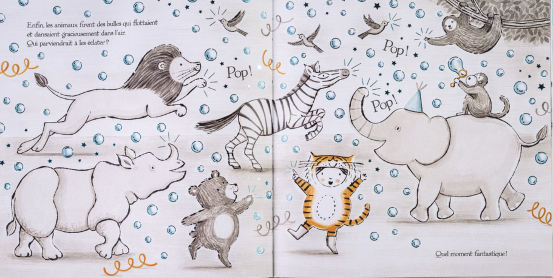 Une nouvelle histoire de la collection qui a pour personnage principal la petite Nina. On aime beaucoup l’univers graphique, plein de douceur et de poésie. Les ballons colorés, rehaussés de motifs brillants, le bestiaire qui attend Nina pour la fête, les jeux et moments de partage….jusqu’au spectacle de toutes ces bulles qui flottent et dansent gracieusement dans les airs!