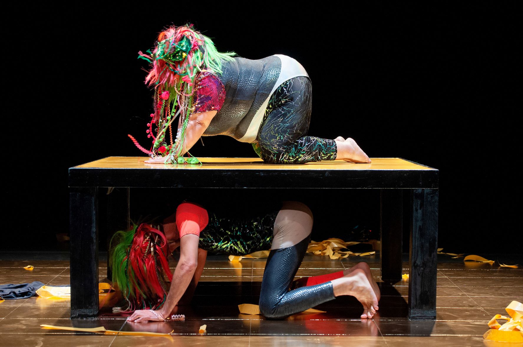 Tout commence autour d’une table. Les deux artistes, tout de noir vêtu, se font écho dans une orgie de mouvements sur une musique mêlant techno et rythmes ancestraux. Leurs visages évoquent une discussion animée quand leurs corps, eux, transpirent la transmission. Mémoires d’Algeria. Des flammes finissent par naître des rondes de bras : le mystique émerge. Suspendu sous la table, Wampach tel une chrysalide, se mue en une inattendue chimère pailletée. Au loin, sa fantomatique complice dévoile un costume tout aussi scintillant et bariolé. L’Alegria, la voilà. Les corps se toisent, se frôlent, s’étreignent, s’imbriquent, exultent, s’embrasent… Deux djinns joyeux, mystérieusement queer, assurément extravagants, célèbrent la liberté dans une allégresse puissante, de toute beauté. L’anagramme du titre est donc bien incantatoire !