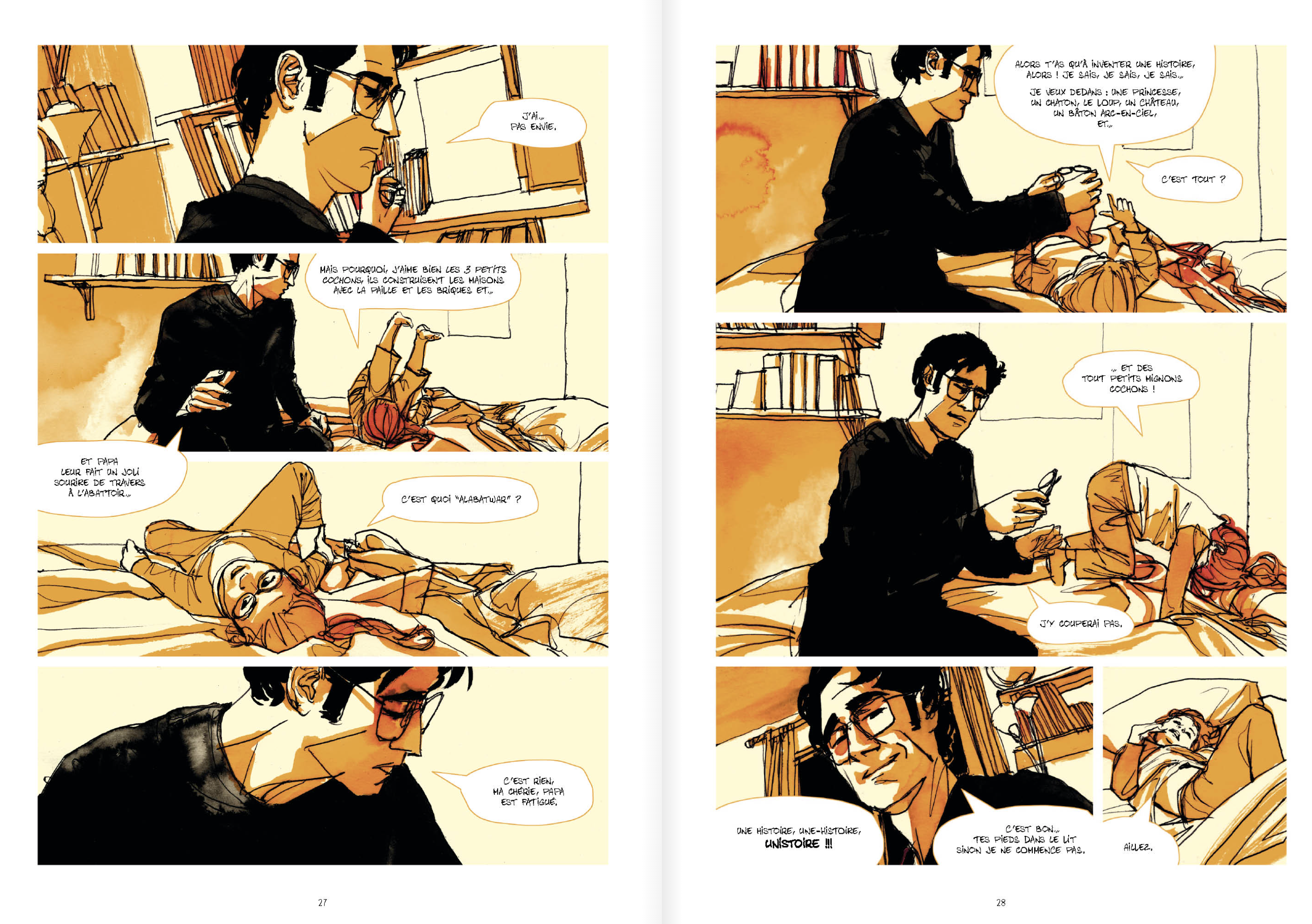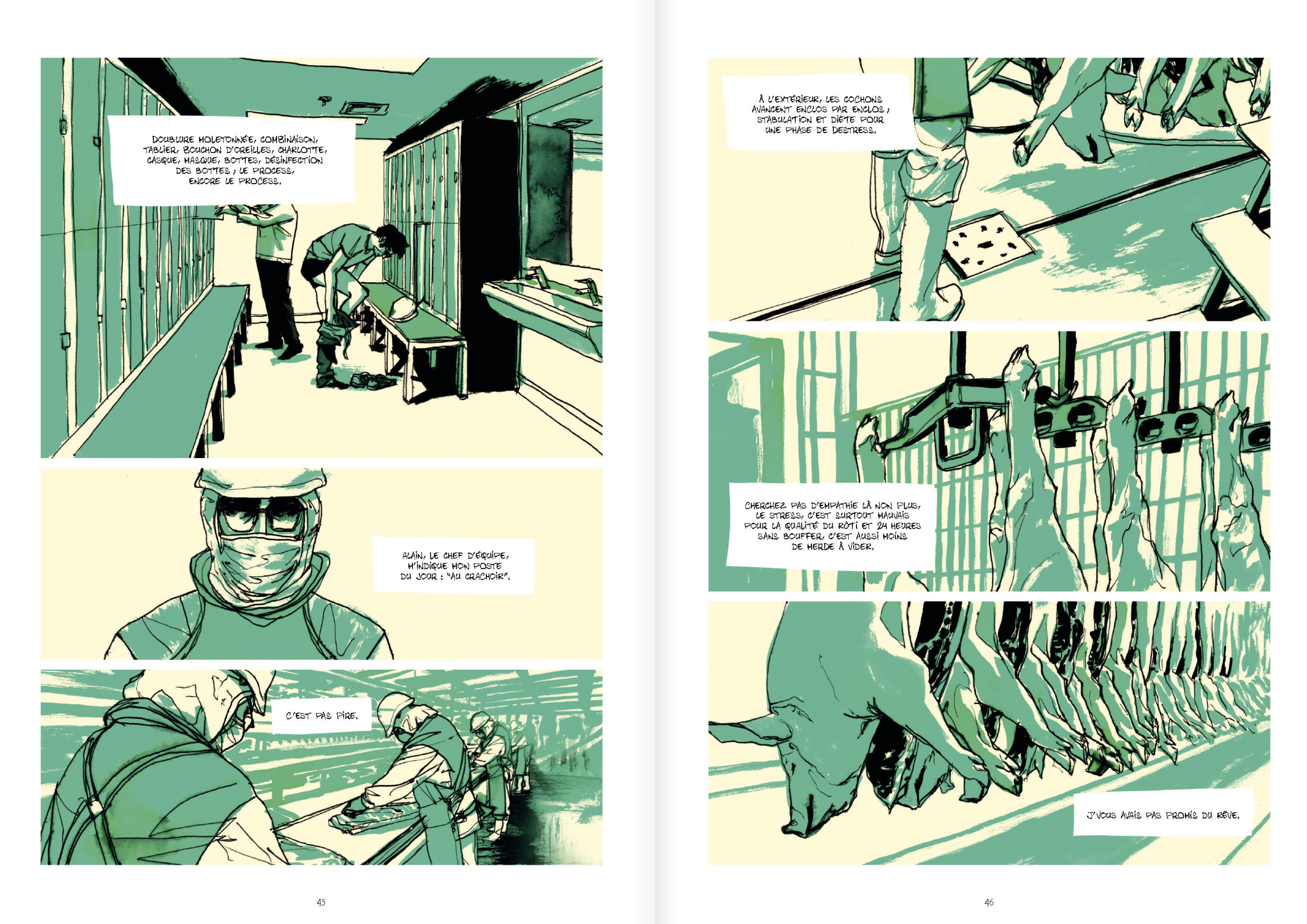 Aude fait des nuits à l’hôpital public et rentre épuisée de conditions de travail lessivantes, de collègues en burn-out à remplacer sur le pouce et de la présence quotidienne de la souffrance des patients ” par manque de moyens”. Fabien, de son côté, bosse dans un abattoir à cochons. Une carrière dégoûtant fortement cet ancien élève des arts appliqués, qui aspirait à vivre de ses talents d’artiste dessinateur et vit très mal so, statut d’égorgeur de bêtes. Le quotidien les broie doucement même si pour Elisa, ils continuent d’être souriants et dynamiques.