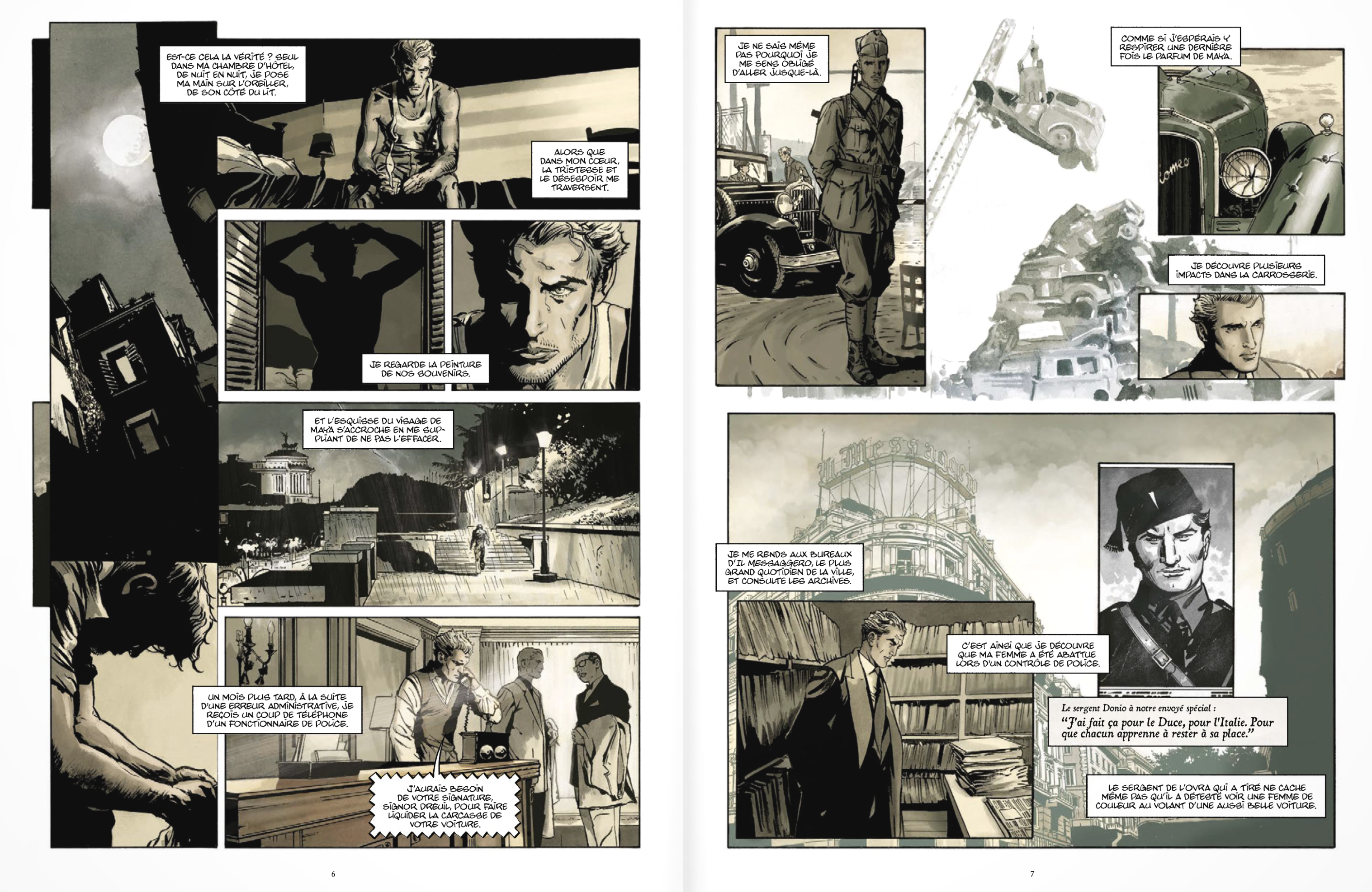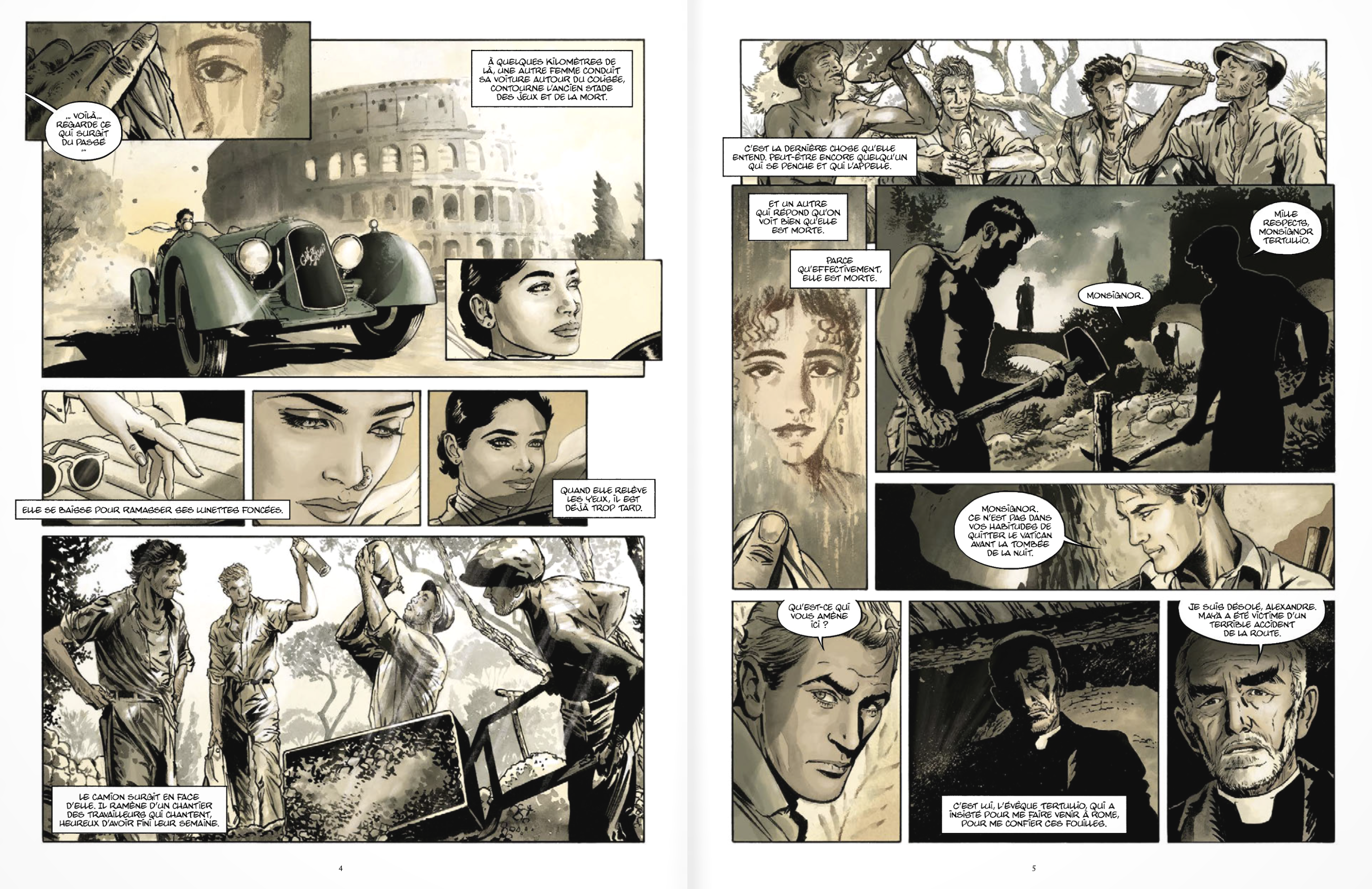 Tout à la fois fresque historique et récit d’aventures, cette bande-dessinée fleuve est séduisante, non seulement pour le voyage spatio-temporel dans lequel elle nous emporte, de l’Europe au Moyen-Orient, du début du premier millénaire à la veille de la seconde guerre mondiale mais aussi pour sa teneur historique ( et quelque peu mystique) passionnante (et exigeante). Les personnages accrochent immédiatement l’intérêt du lecteur, même ceux de second plan et les péripéties nombreuses et rebondissantes stimulent encore davantage l’envie de ne pas lâcher le livre. On frissonne dans l’oasis de Siwa, au sein de la nécropole antique, aux côtés d’Omar et Alexandre, à chaque bombe ou coup de mitraillette tiré par les allemands; on frémit à Beyrouth d’un regard glacé inébranlable ; on se prête à rêver devant les berges du Nil grandiose, au coucher du soleil ; on retient son souffle au monastère Sainte-Catherine, au creux des montagnes désertiques du Sinaï, dans la pénombre et les bras d’Alexandre…