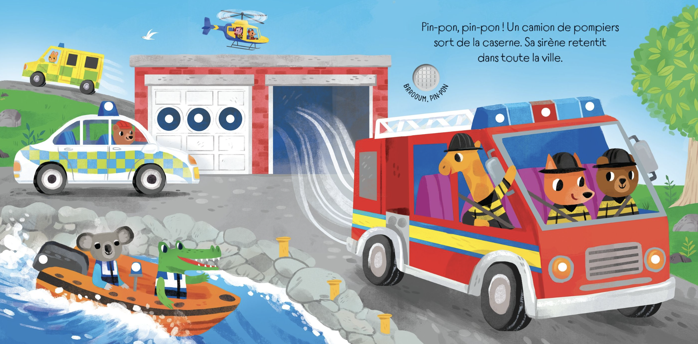 Penchons-nous davantage sur ce dernier : une première double-page nous embarque à bord d’un hélicoptère de secours. Au milieu des montagnes, on entend les pales tourner et on voit le projecteur qui brille à la recherche des alpinistes perdus….page suivante nous attend un bateau de sauvetage qui fend la mer pour ramener en sécurité un baigneur égaré…puis derrière encore, déjà s’invite une star chez les petits : la voiture de police et son gyrophare bleu! Et puis l’ambulance qui roule à toute allure! Et enfin, vous l’aurez deviné : la star absolue chez les bouts de choux dans les véhicules de secours : le camion rouge de pompiers! Pin-pon pin-pon : la sirène retentit et les lumières clignotent de plus belle!