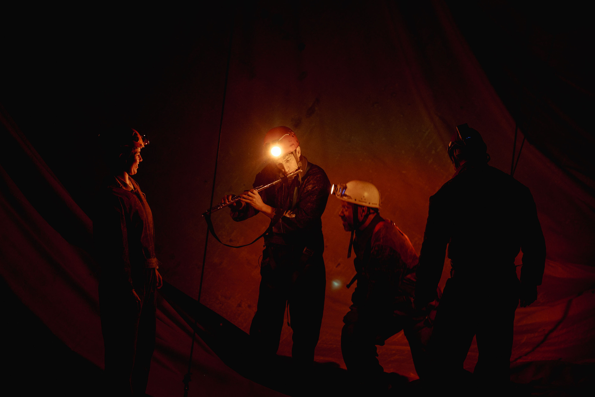 L’ensemble des changements se font à vue et les jeux de lumière apportent de la profondeur et un vrai univers onirique dans les phases exploratoires où les lampes frontales jouent un jeu d’immersion profonde dans les entrailles du public. Les comédiens apportent tous leur personnalité sur le plateau avec différents niveaux de sensibilité et beaucoup de ruptures nettes et précises pour casser le quatrième mur, et des nuances pour faire des apartés personnels faisant vivre les questionnements de leurs personnages.