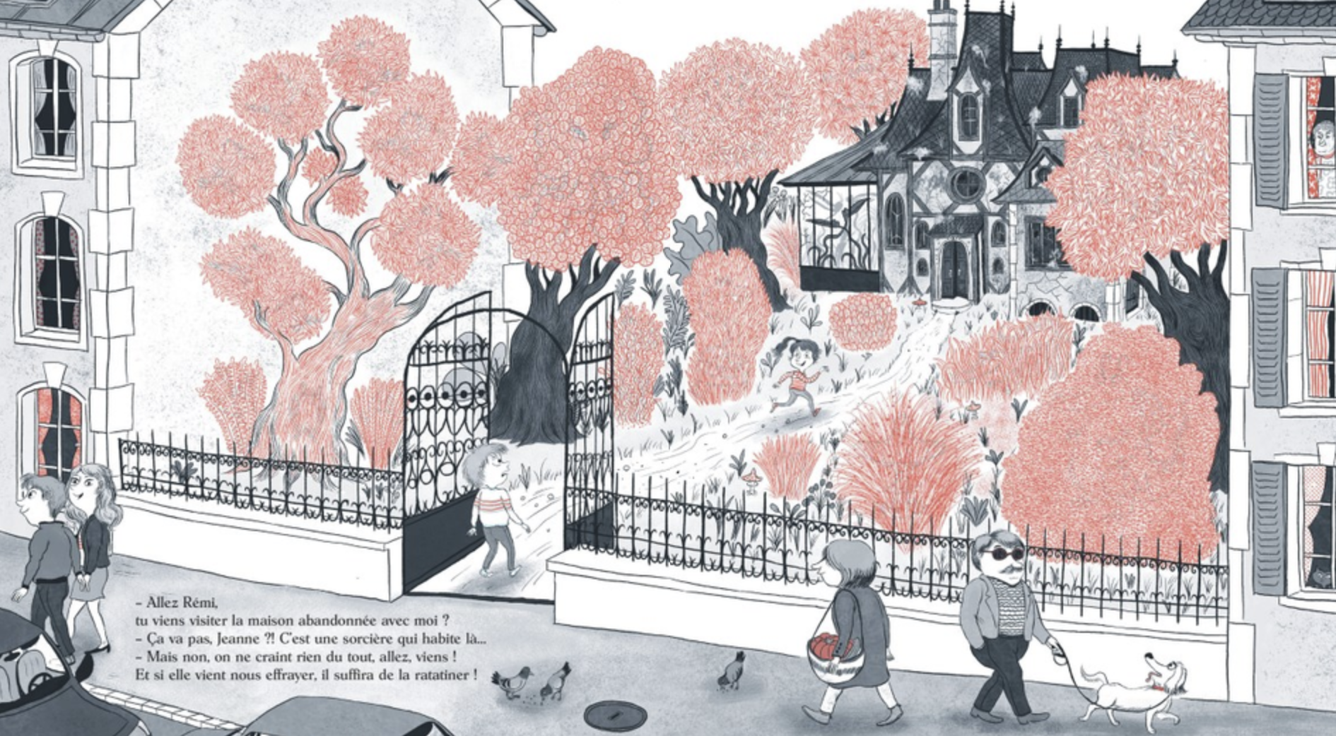 Rémi la prévient : c’est dangereux car une sorcière y habite! Une sorcière! se gausse Jeanne..eh bien il n’y aura qu’à la ratatiner en cas de problème! Les voilà donc embarqués dans une aventure pleine de rebondissements et de créatures inquiétantes qui se cachent sur toutes les pages et que les petits lecteurs sont invités à débusquer grâce à une loupe à filtre rouge.