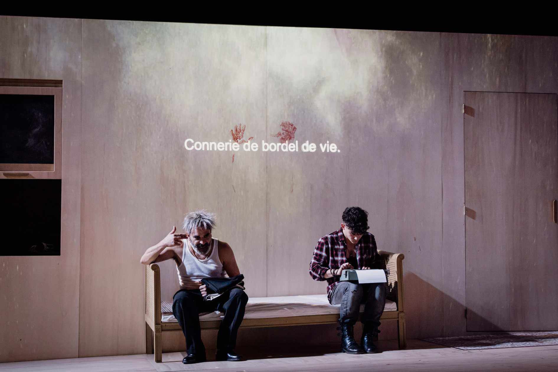 On s’affaire, on sollicite une voisine esseulée et aimante, on évoque sans cesse un fils disparu, on tue sauvagement un mouton, on prépare la table, on cuisine avec ce que l’on a – même si ça n’est pas de premier fraicheur -, on se dispute, on s’embrasse….et tout cela est raconté par un jeune auteur libanais, expatrié au Canada ( double de Wajdi Mouawad qui écrivait en 1991 les premières lignes de ce texte à l’âge de 23 ans), que l’on aperçoit derrière une fenêtre enneigée en train de taper sur sa machine à écrire et qui finit même par interagir avec un personnage et à fouler les planches.