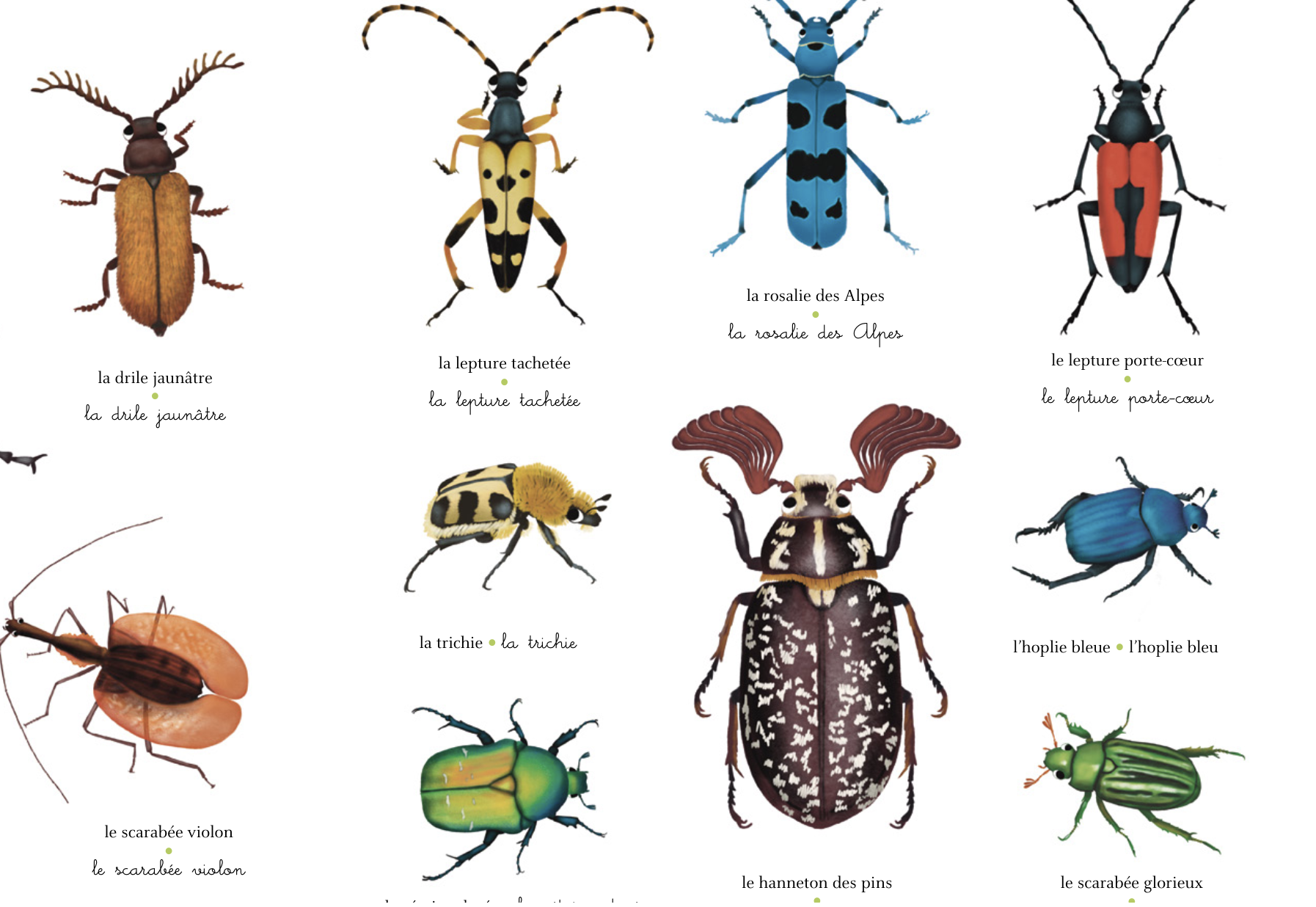 Adeline Ruel a imaginé celui qui concerne les insectes et l’on plonge dans les immenses pages cartonnées de ce livre avec ébahissement. D’abord les différentes abeilles, bourdons, guêpes, fourmis….puis les libellules et les agrions, les mouches, syrphes et moustiques…..les coccinelles, chrysomèles, scarabées…punaises, cicadelles, cigales….sauterelles, criquets, grillons….phasmes….mantes….papillons….tout un peuple d’insectes est présenté dans de très jolis et réalistes dessins que l’enfant et l’adulte observent, détaillent, comparent….