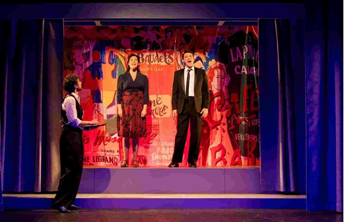 Ecrite avec beaucoup d’humour, « La voix d’or » nous offre une dynamique joyeuse et lumineuse alternant avec les émotions et la profondeur des blessures de certains personnages : le sourire charmeur et l’allure séductrice sur scène, les tourments et jalousies côté coulisses. La scénographie découpe le plateau entre l’arrière-plan, symbole du passé glorieux et des scènes de cabaret, et l’espace devant pour les scènes actuelles ou familiales douloureuses. Pour faire vivre autant de rebondissements, la mise en scène apporte beaucoup de variétés entre humour, émotion, poésie, parties narratives ou dialoguées, chorégraphies et bien évidemment partitions musicales.