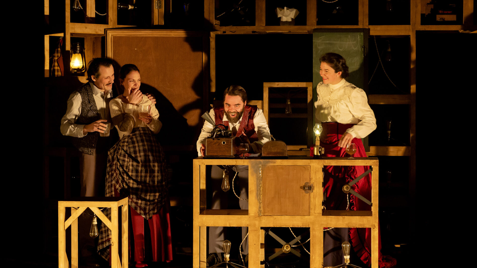Qui dit lumière dit beaux éclairages sur le plateau et en la matière la scénographie est particulièrement réussie avec un dispositif astucieux et ingénieux pour faire vivre l’espace. Une grande structure de bois modulable qui nous permet à partir des manœuvres de ce seul élément de passer de l’atelier d’Edison à celui de Westinghouse, de virevolter entre l’intérieur des deux familles.