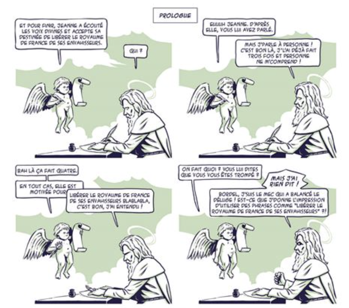 Jeanne, dans cette version très parodique, est une fiéffée idiote…et Dieu désespère de lui faire entendre raison. Il ne lui a jamais donné la mission de délivrer la France de l’occupation anglaise…et d’abord parce qu’il a une foi très réduite en l’humanité qu’il a créée et qu’il a des envies régulières de recourir au bon vieux déluge nettoyeur tant il est mortifié par la bêtise de son troupeau de fidèles. Alors, parce qu’il a tout de même bon coeur, il descend sur terre pour lui expliquer qu’elle n’est pas l’élue d’une quelconque parole divine. Mais Jeanne est têtue au possible, à moins qu’elle ne soit orgueilleuse? Dieu la suit d’étape en étape, tentant de la protéger comme il peut de sa propre “folie”….