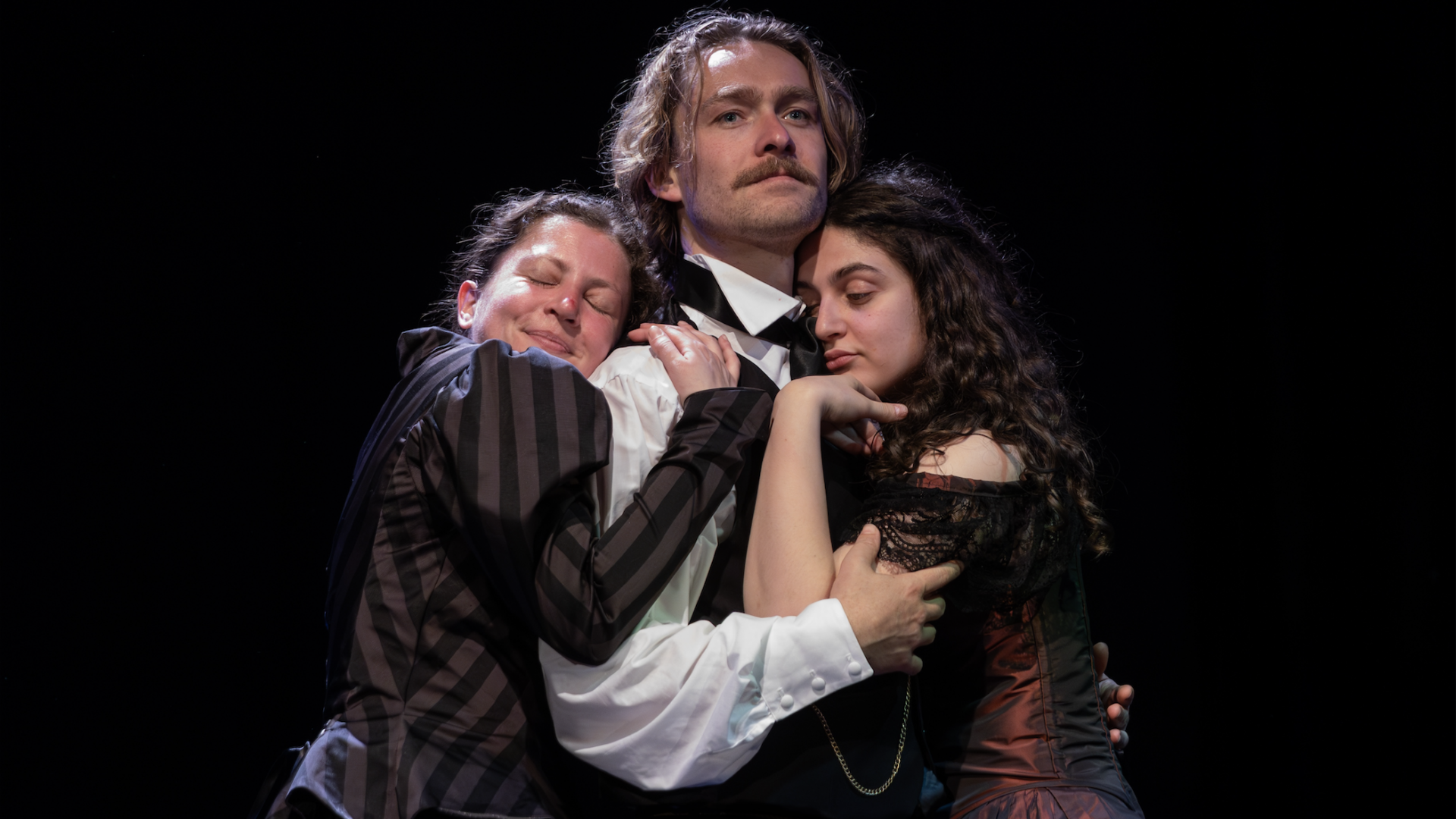L’adaptation de Claudie Russo-Pelosi, qui met également en scène, dégage, en une heure et vingt minutes, avec bonheur, la substantifique moelle d’une œuvre de près de 400 pages : les personnages y sont remarquablement servis par les comédiens de la compagnie Les Joues rouges, évoluant en parfaite maîtrise des arts de la scène ; l’esthétique (décor de toile sur laquelle sont projetées des images, accessoires marquant les changements d’ambiance), dans lequel évoluent les personnages, évoque, lors de certaines scènes, les toiles des maîtres de ce temps-là : Manet, Caillebotte, Renoir, voire Lautrec (pour ses prostituées que fréquentaient Maupassant et son personnage, Bel-Ami). Cette adaptation au théâtre, où l’humour affleure à tous moments, se révèle, étant une plongée dans une époque minée par l’argent et les dégâts qu’il produit sur la société et les gens, du haut en bas de l’échelle, d’une troublante actualité : place délétère prise par la recherche du profit, mépris des êtres et de l’humanité. Y émerge, également, le rôle de la femme, de son émancipation d’une forme pressante du patriarcat ambiant, qui pallient, avec leurs amants, les manques affectifs d’époux tout à leur quête de la fortune économique et politique, thème on ne peut plus neuf quand Maupassant édifia son œuvre. Le fait de transporter le texte au théâtre lui donne force : on y joue, comme on joue dans la société : tout est apparence et conventions, tout est exacerbé. Un spectacle (certaines scènes tiennent de la chorégraphie), où rien n’est occulté des dévorantes et sensuelles passions, d’une sobre virtuosité, cependant. Emoustillant.