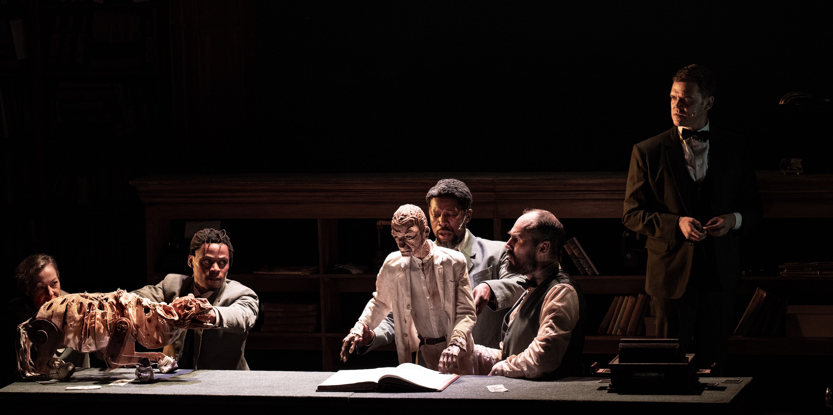 Face à nous, un laboratoire paré de grandes bibliothèques et, en fond de scène, un écran sur lequel est projetée une animation filmique d’une virtuose qualité, créée par le metteur en scène lui-même, William Kentridge. Ces projections font tour à tour office de décors, de “paratexte”avisé, d'”entractes” et l’on reste admiratif de la qualité du dessin, de la précision du trait, de la pertinence accrue de leur existence. Et puis, il y a, ensuite, ces extraordinaires marionnettes d’Adrian Kohler et Basil Jones qui prennent vie sous nos yeux, nous éclaboussent de leur puissance évocatrice et servent, bien mieux qu’un être de chair et d’os, le propos. Ne sommes-nous pas, tous et toutes, des marionnettes? Manipulé.e.s, manipulables, soumis à une destinée dont nous ne tirons pas tous les fils? Pantins qui “ne peuvent exister que dans l’éternelle brume de l’illusion”?