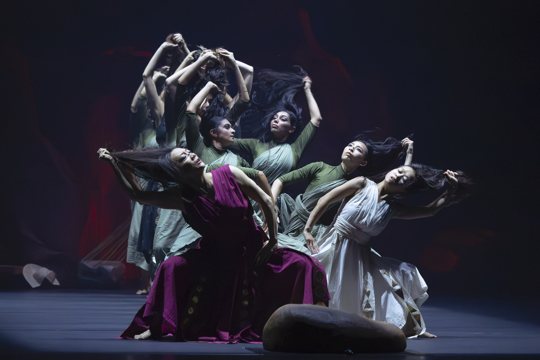 Si la composition sonore de Gareth Fry vibre à l’unisson avec ces bacchantes du Moyen-Orient, elle n’en est pas pour le moins oppressante sur la longueur et ternit un peu la beauté de ce spectacle incomparable. Ces 14 femmes jouent de leurs longues chevelures, de leurs bras et de leurs mains – berceaux, imposent un rythme, un souffle extraordinaire de grâce et de solennité. Les ensembles sont particulièrement époustouflants tant ils vibrent dans chaque pas, chaque visage, chaque impulsion.